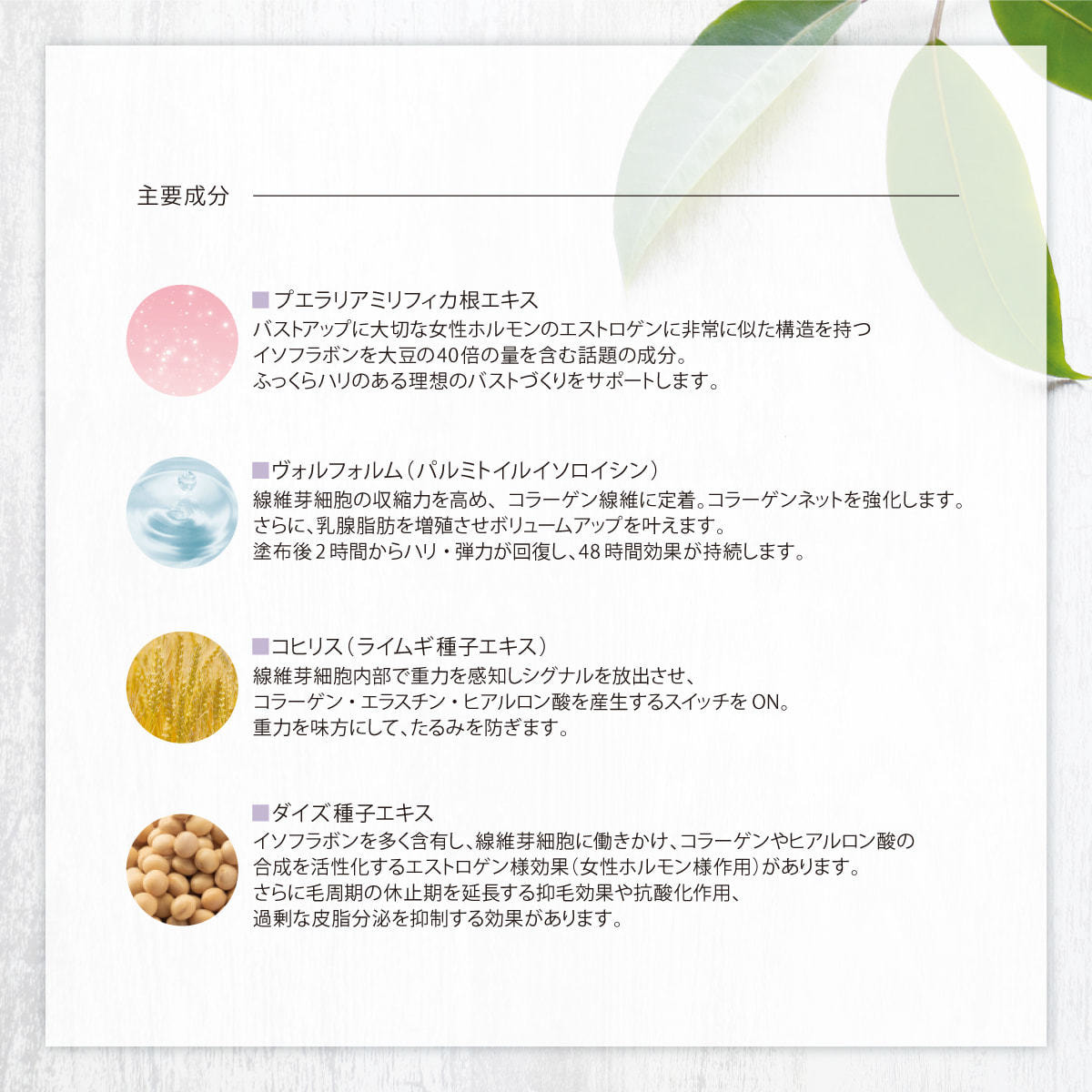 女性らしいプロポーションづくりをサポートする「プエラリアミリフィカ」と引き締めながらボリュームをもたらす「ヴォルフォルム」のW処方でハリのあるふっくらとした胸元に導くバストケア美容液。
